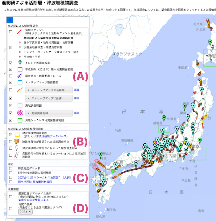 産総研が実施した活断層調査地点と公表した成果を表示・検索できます。 海域調査の調査範囲や測線および各種情報も表示されます。