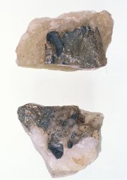 | Description | 石英中の黒色短柱状結晶。 | |||||||||