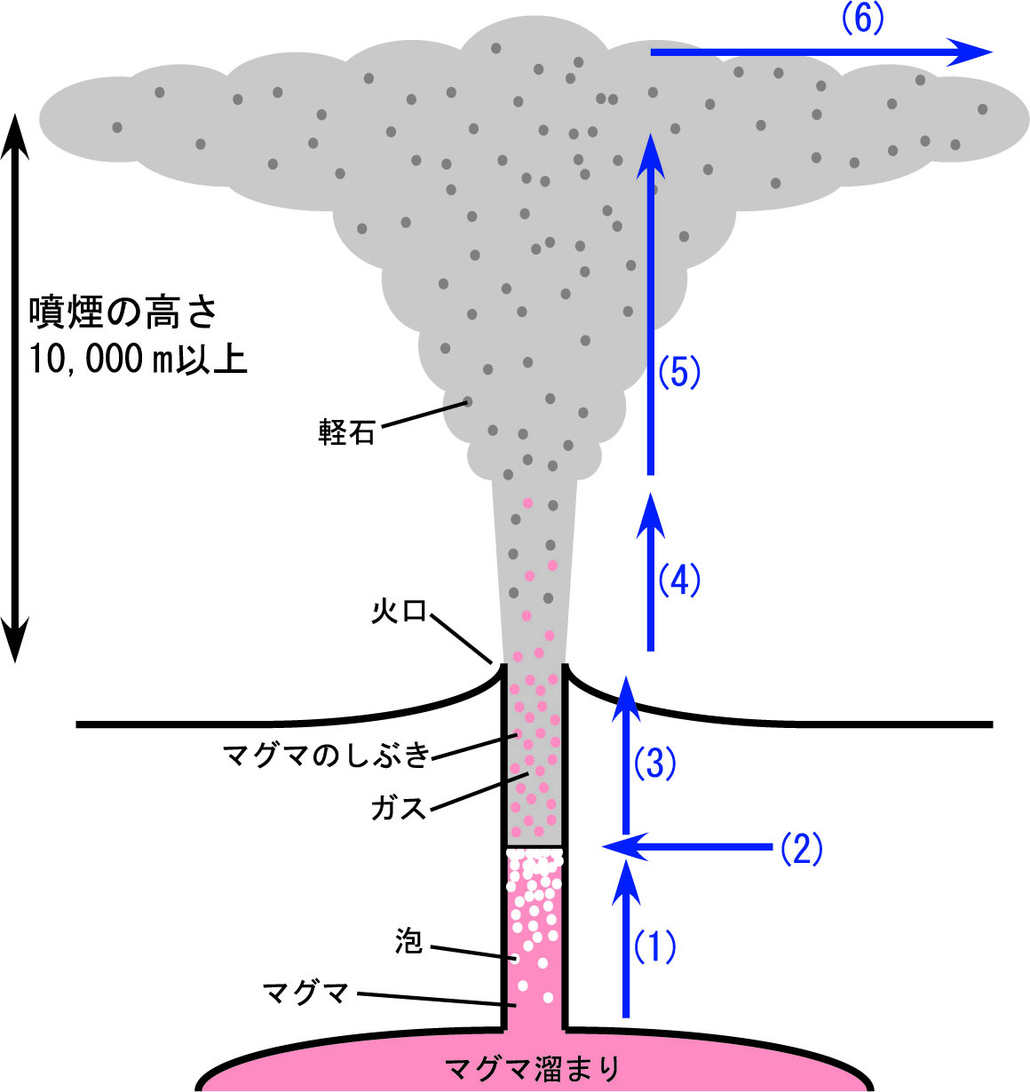 (1) マグマが地下から上昇し,ガス成分(主に水)が泡立つ