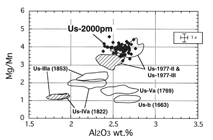 有珠火山2000年軽石 (Us-2000pm) に含まれる磁鉄鉱斑晶(◆),および過去の噴出物中の磁鉄鉱(囲み)との組成の比較(東宮ほか, 2001).噴出年によって,磁鉄鉱の組成が少しずつ違う.1977年 (Us-1977) と2000年 (Us-2000) は組成範囲が近いが,前者はバイモーダルである(2つの組成グループからなる)のに対し,後者は均質である(1つの組成グループに固まる)という違いがある.こうして,磁鉄鉱組成の分布から2000年軽石は過去の噴出物と区別できた.このことから,2000年軽石は今回出たマグマ(本質物質)である,と判断された.