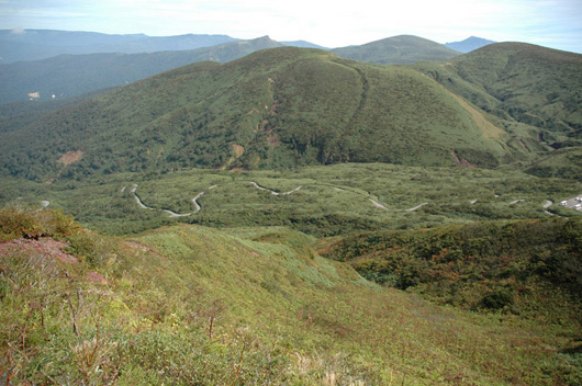 片倉沢溶岩流(KZ)は,男女岳北東1km付近から,片倉岳,笹森山間の谷地形に沿って,北西方向へ流下した溶岩流です.表面微地形の保存が良く,上面両側に溶岩堤防が認められます(写真).両側断面で確認できる最大層厚は7mで,層厚3m程度のフローユニットが2枚確認できます.黒色緻密な溶岩で,斜長石巨斑晶とカンラン石が肉眼でも見えます.赤倉沢で笹森火山噴出物と赤倉沢火砕流を,片倉沢では片倉岳火砕丘と赤倉沢火砕流をそれぞれ被覆しているのが確認できます.また,八合目小屋〜焼森登山道沿いの標高1350m付近で,北部第2火砕丘(HO2)由来の転動堆積物を被覆する一方で,東麓ではHO2由来の崖錐・転動堆積物に被覆されています.層序関係と構成岩石の岩石学的特徴の類似性から,この溶岩流はHO2およびAK-6と同時期に噴出したものと考えられます.従って,形成時期はAK-6の噴出した7200-7100年前頃と思われます.