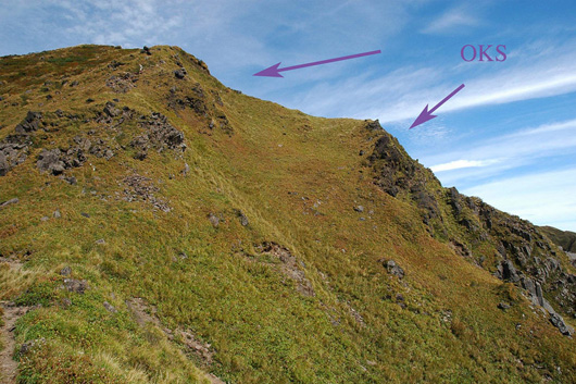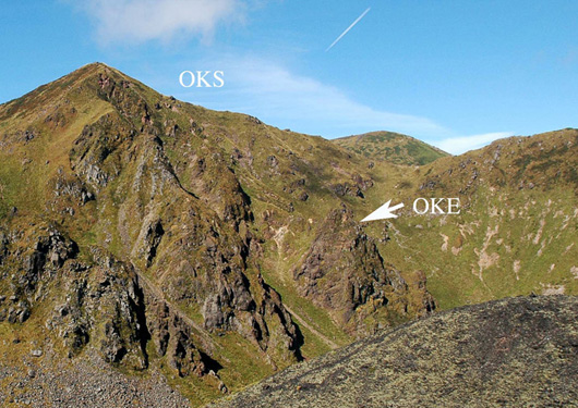 男岳山頂溶岩流(OKS)は,須藤・石井(1987)による男岳溶岩のうち,男岳山頂周辺に露出するものを指します.東側は山頂東方の鞍部まで(写真1),西側はカルデラ西壁の五百羅漢岩脈付近まで分布が確認できます(写真2).
