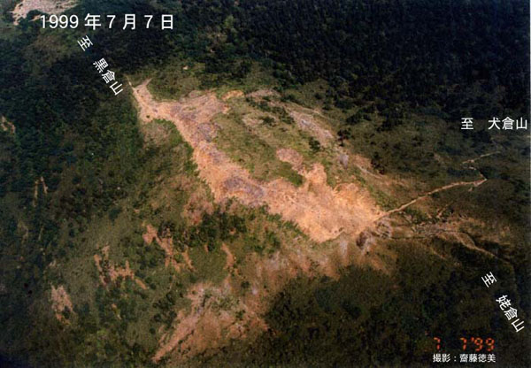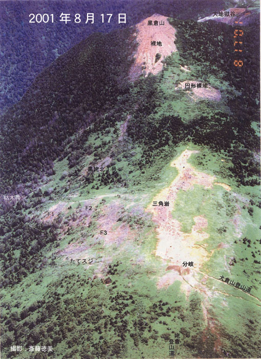 写真は,姥倉山を写真手前として,黒倉山に至る稜線部を撮影したものを選択した.この稜線部は以前から弱い噴気活動があったため裸地化していたが,1999年以降の活動では,特に稜線から南および北斜面に,ほぼ東西(稜線に沿った方向)の小断層に沿って裸地化が進行した.