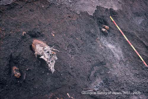 ![]() 図5.流下中に巻き込まれた樹木 樹皮の残る木材片が,岩屑なだれ堆積物中に散在する. |