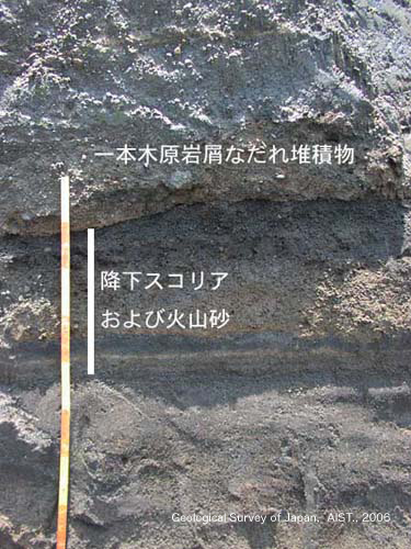 一本木原岩屑なだれ堆積物が覆う尻志田スコリアは,下部の細粒スコリアと上部の粗粒スコリアに区分される.これらの降下火砕物火砕物の間には,露頭によっては有機分多いユニットが介在される場合があるが,山体に近づくと細粒の火山灰が噴火の休止.このことから,この火砕物は,長期間にわたり断続的に発生した小噴火により堆積したと考えられる.