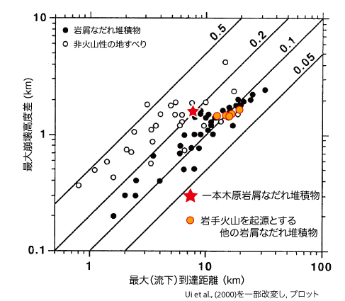 一本木原岩屑なだれ堆積物の最大崩壊高度差と最大流下到達距離の比(H/L比)の値は0.2程度である.これは,火山体で一般的に認められる大規模な岩屑なだれ堆積物と比較すると,一本木原岩屑なだれ堆積物の流動性が乏しかった事を示している.