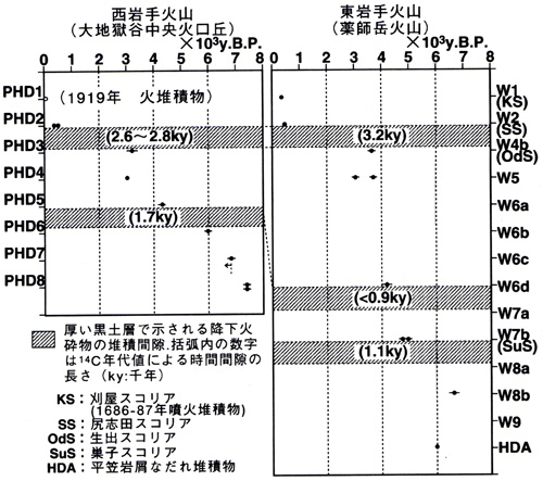 ![]() 図4.東岩手(薬師岳火山)の噴火と,西岩手(大地獄谷)における噴火年代の比較 (土井,1999a)より引用