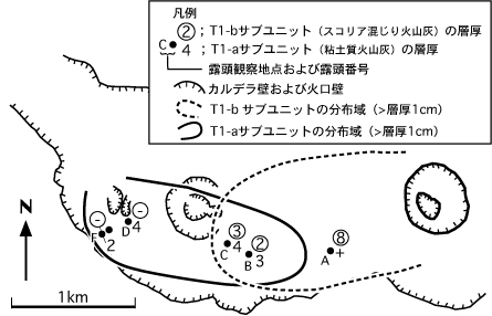 露頭観察地点の記号は図3による.水蒸気爆発による粘土質火山灰T1-aが,スコリア・火山砂質のT1-bに直接覆われる.