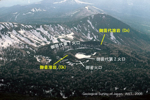 この付近を噴火中心として,溶岩流の流出(溶岩ドームの形成)と溶岩の一部を破壊し火口地形を形成する爆発的な噴火が繰り返した.直径約500mの御苗代第1火口の内部に,御釜溶岩(溶岩ドーム)が噴出した後に,御苗代第2火口および御釜火口が形成された.