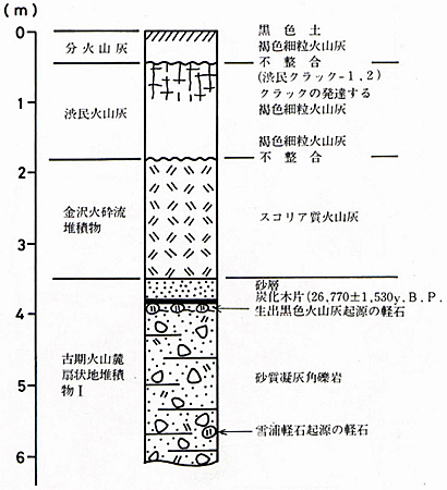 この火砕流堆積物の上位には渋民火山灰(層)に発達するクラック帯が認められること,下位層準の炭化木片の14C年代が26,770±1,530y.B.Pであることから(土井・大石,1992),噴出年代は約3万年前と推定されている.