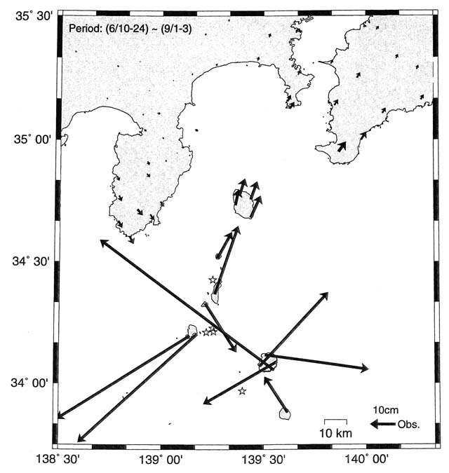 2000年6月26日18時30分頃から,活発な地震活動と急激な地殻変動が観測され ,19時33分緊急火山情報が発令された.翌日未明を境に山体は収縮・沈降に転じ(Ukawa et al., 2000b)、島内西部で開口性割れ目などの地変が認められたものの,6月28日朝には阿古沖の海底で小噴火があっただけで陸域では噴火は起こらなかった.地震の活動中心は三宅島から北西30kmにある神津島・新島近海に向かって移動していった.この変動はマグマの上昇とそれに引き続く側方への貫入をとらえたものである. |
