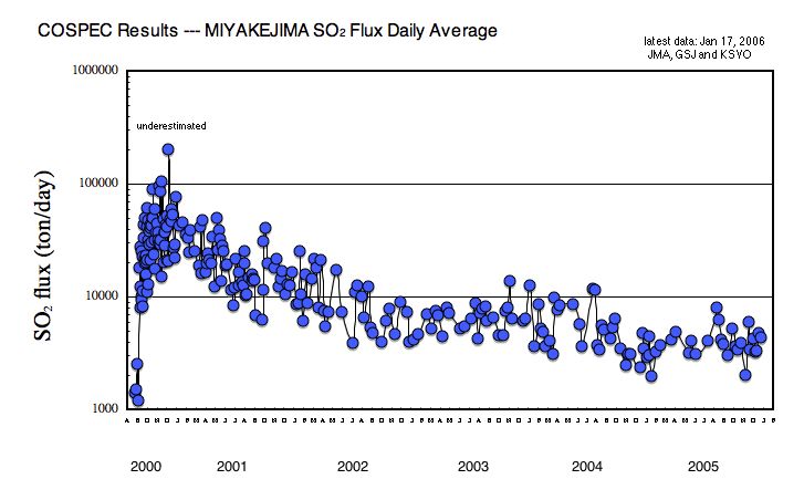 | 図33 噴煙中の二酸化硫黄ガスの1日あたりの噴出量の変化.(気象庁,産総研,東工大データによる) |