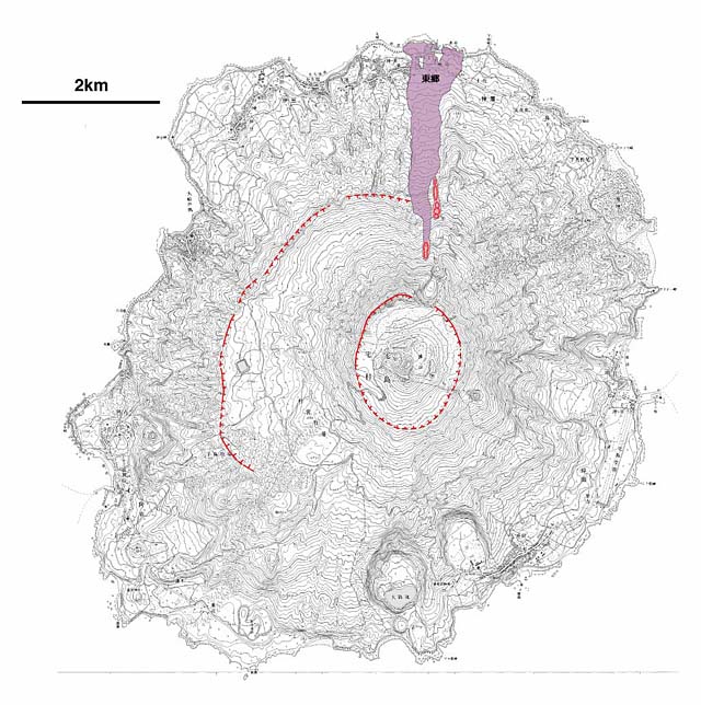 | 1874(明治7)年7月3日正午ころ,突如として激しい地震,鳴饗が起こるのと同時に,噴火が北北東山腹の標高560m付近から始まった.火口は割れ目状に標高200m付近まで開口した.南西風によって噴煙が火口東側の土佐〜砲台方面に吹きかかり,粗い火山灰が大量に降下した.スコリアの降下後,溶岩が流れ出した.夕方近くに現在の神着地区の東にあった東郷(ひがしごう)集落を経て,海中にまで流下した.噴火,鳴動は4日後まで,活動は約2週間続いた.この噴火で東郷の30戸余りが埋没し,1名が行方不明となった. |