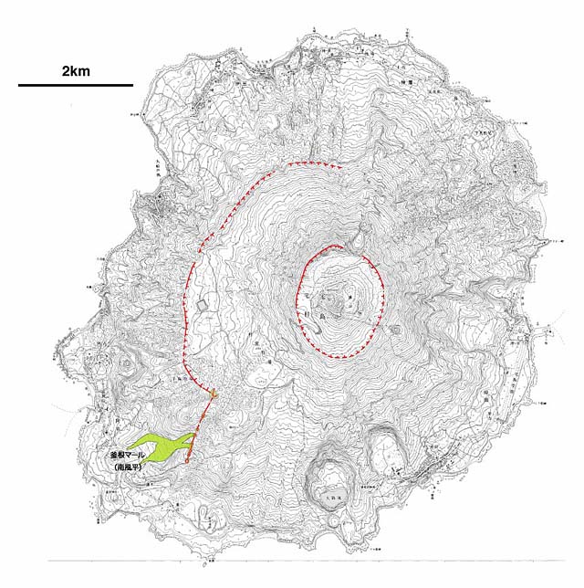 18世紀に起きた3条の割れ目噴火のうち,最も西の割れ目火口列からは釜根マール(南風平)と薄木へ溶岩が流れ下った.この割れ目噴火は1763〜69年の後半に起きた噴火,あるいは古記録から漏れた1769年以降の噴火,のいずれかであろう.岩石の化学組成には1763年の噴出物と差異がみられる.